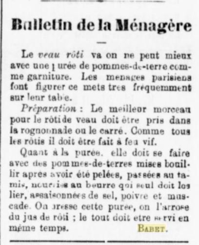 Le veau rôti va on ne peut mieux avec une purée de pommes-de-terre comme garniture. Les ménages parisiens font figurer ce mets très fréquemment sur leur table.