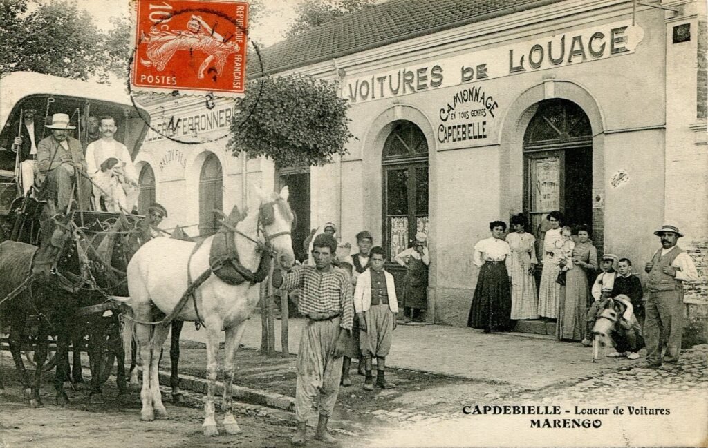 Cette carte postale « Capdebielle – Loueur de Voitures – Marengo » s’inscrit parfaitement dans cette histoire. C’est une carte publicitaire de commerce : l’entrepreneur l’a fait éditer pour montrer sa façade, ses attelages, son personnel et son activité — à la fois réclame et carte de visite envoyable par courrier.