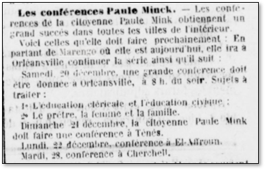Le 21 décembre 1884, elle donne une conférence à Marengo. Les thèmes évoqués par Paule Minck furent l’éducation cléricale et civique, le prêtre, la femme et la famille. En 1886, le journal « Le Radical Algérien » indique qu’elle compte revenir en Algérie pour s’y établir définitivement ce qui ne fut jamais le cas.