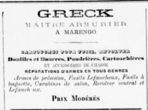 A Marengo, dans les années 1870 – 1880 il y avait une armurerie tenue par la famille Greck. Des recherches m’ont permis d’identifier Jacques Greck qui était né à La Valette, Malte le 25 novembre 1835. Son épouse s’appelait Philomène (née le 27 mars 1852 à Bouzareah) et ils eurent trois enfants nés à Marengo, Angèle née le 1er novembre 1882, Amédée né le 15 septembre 1884 et François né le 28 octobre 1886. Concernant Philomène on constate comme souvent des différences dans les âges mentionnés sur les différents actes. De plus quand on regarde l’acte de naissance on constate un prénom orthographié différemment, « Philoméla Joséphine » et le nom de famille est Greck, originaire de Malte… Jacques et Philomène étaient donc probablement cousins.