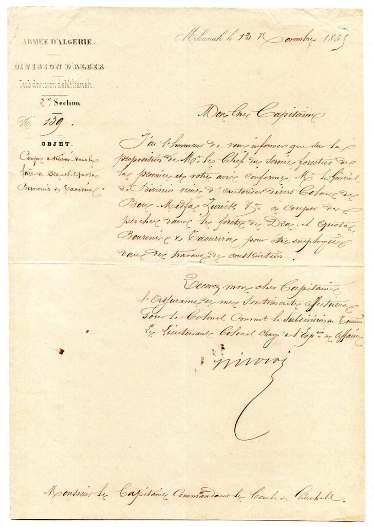 Mon cher Capitaine, J’ai l’honneur de vous informer que sur la proposition de MM les chefs de services forestiers et notre avis conforme M. le Général de division …, d’autoriser divers colons de Bou-Medfa et Zurich à couper des perches dans les forêts de Draz el Quotas, Bou Rouiz et Taourira pour être employées aux travaux de construction.