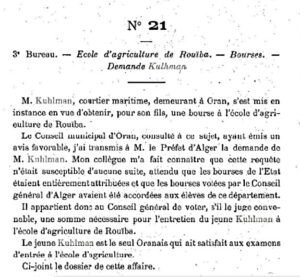 En avril 1889, Sigurd Kuhlman fait une demande de bourse pour son fils Georges Kuhlman qui vient de réussir l’examen d’entrée de la nouvelle Ecole d’Agriculture de Rouiba (1). Georges est le seul Oranais ayant réussi l’examen. Malgré le soutien de la mairie d’Oran, le conseil général d’Oran refuse la bourse eut égard à la fortune de Sigurd. Cette demande de bourse est la seule source trouvée indiquant les études poursuivies par Georges. Inexistant en 1830 à l’arrivée des Troupes Françaises, l’Enseignement Agricole en Algérie, ne prit son essor qu’en 1881 avec la création de l’Ecole Pratique d’Agriculture de Rouïba. »