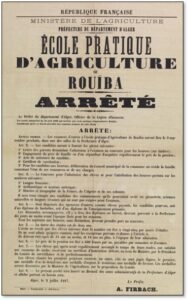 La création de l’Ecole Pratique d’Agriculture de Rouïba, en 1881, dont l’ouverture en février 1882, marque le début de l’Enseignement Agricole en Algérie. Elle est l’ancêtre de l’Institut Agricole d’Algérie à Maison-Carrée, Institut qui deviendra l’Ecole Nationale Supérieure Agronomique d’Alger, l’une des quatre Ecoles Nationales avec celles de Paris, Grignon, Montpellier et Rennes.