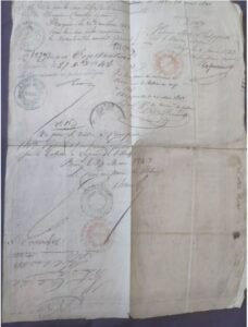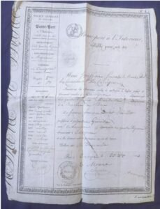 À partir de 1848, lorsque l’Algérie fut divisée en trois départements (Alger, Oran et Constantine), les règles évoluèrent. Les Français pouvaient désormais utiliser leur passeport intérieur standard, mais devaient le faire viser par les autorités locales à leur arrivée en Algérie. Les tampons apposés par les bureaux arabes, les commandements militaires ou les mairies algériennes attestent de ces contrôles. Dans l’exemple présenté, le passeport de 1842 porte les mentions « Vu à Bône », « vu à Philippeville et « vu à Alger » , avec le cachet des mairies et illustrant le parcours d’un Géomètre-Arpenteur à travers le territoire algérien.