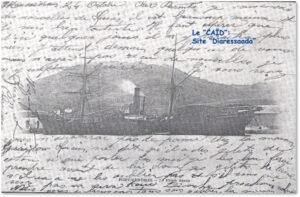 J’ai voulu également m’intéresser à ce navire qui faisait du cabotage le long des côtes d’Algérie, le Caïd. Très rares sont les photos existantes même sur internet à part celle ci-dessous qui présente une image fortement altérée par un texte de correspondance.