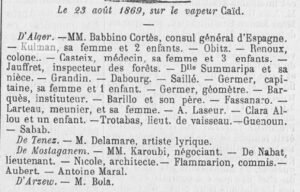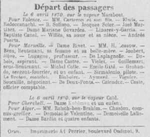 L’enfant est bien entendu Victor, né le 25 janvier 1865 à Marengo et a maintenant six ans. Il n’est pas fait mention d’Adèle, née elle aussi à Marengo le 1er août 1866. Nous n’avons pas retrouvé d’acte de décès concernant la jeune Adèle, le seul acte qui existe est celui de naissance puis plus aucune trace. Mon hypothèse était qu’elle était peut-être décédée hors d’Algérie et peut-être lors du voyage de la famille Kuhlman en Suède en 1867 à l’occasion de la réception relative à la nomination de Josef comme Chevalier de l’Ordre de Wasa (voir par ailleurs). Mais en Suède également on ne trouve pas de trâce d’un éventuel décès… et, la bibliothèque nationale de France ayant complété la digitalisation de certains journaux, dont L’Echo d’Oran, j’ai pu retrouver un autre avis de passage, daté du 23 août et en provenance d’Alger cette fois. Madame Kuhlman, accompagnée de deux enfants. Il est donc fort probable qu’Adèle soit décédée entre ces deux dates. Entre le 23 août 1869 et le 6 avril 1870.