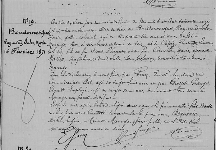 Acte de décès de Jules Boudouresque le 16 février 1871. A noter la signature du maire, Michel Eugène Beauvais mais aussi en tant que témoin de Edouard Grosset-Grange (2).
