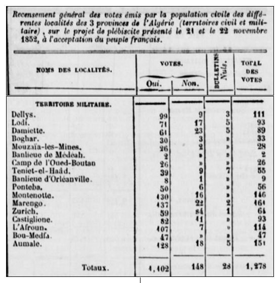 Un an plus tard néanmoins, lors du deuxième plébiscite destiné à valider le rétablissement de l’Empire, le vote dut nettement plus favorable surtout dans les campagnes Algériennes…