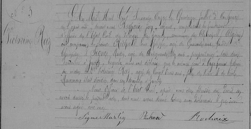 Si ce récit fut fortement inspiré par le texte de Rinn (Histoire de l’insurrection de 1871 en Algérie, 1891), le nom des personnes concernées à Zurich n’était pas mentionné. C’est l’analyse des actes civils de la commune de Zurih qui a permis de retrouver les noms du « vieillard » de 67 ans et de la jeune fille Victorine Raz. L’acte de décès ne mentionne pas les circonstances du décès mais le doute n’est pas permis. Pour la petite histoire, les coupables du crime furent reconnus sur la place du marché de Marengo un peu plus tard par la mère et furent traduits en justice et … décapités par guillotine sur la place du village et présence de nombreux badauds…