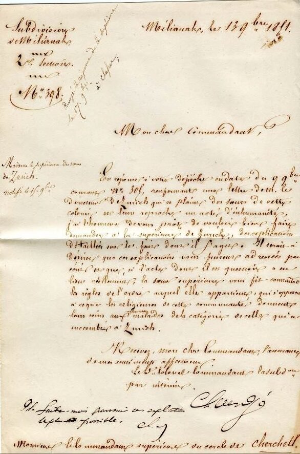 En réponse à votre dépêche en date du 9 novembre courant n°305, renfermant une lettre de M. le Directeur de Zurich qui se plaint des Sœurs de cette colonie et leur reproche un acte d’inhumanité, j’ai l’honneur de vous prier de vouloir bien faire demander à la supérieure de Zurich des explications détaillées sur les faits dont il s’agit. Il serait à désirer que ces explications vous fussent adressées par écrit et que, si l’acte dont il est question a eu lieu réellement, la sœur supérieure vous fît connaître les règles de l’ordre auquel elle appartient, qui s’opposent à ce que les religieuses de cette communauté- donnent leurs soins aux femmes malades de la catégorie de celle qui a succombée à Zurich.