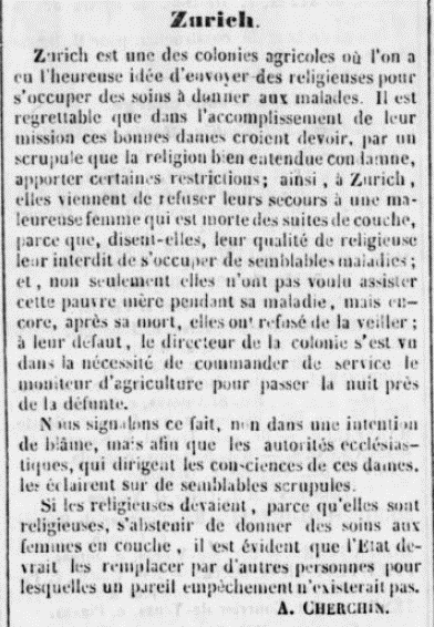 En novembre 1851, une affaire fit grand bruit à Zurich et dans les alentours. Les sœurs de Zurich n’avaient pas voulu secourir une pauvre femme en couche et qui venait de décéder. Le journal « L’Atlas » s’en émut sans néanmoins dévoiler tout le dessous des cartes. Les sœurs prétextèrent ne pas avoir à s’occuper de telles «maladies ». Mais de quelle maladie s’agissait-il ? D’un accouchement ? Si le journal signala le fait, il refusa néanmoins de trop blâmer les sœurs de Zurich, préférant fustiger les autorités ecclésiastiques et l’état comme principaux responsables de la situation. Et ce sont les militaires qui vont se chargèrent de sermonner fermement les Sœurs comme le montre la lettre du Commandant Supérieur de la subdivision de Milianah qui écrit au Colonel Vergé, en poste à Cherchell, suite à l’information remontée par le directeur de la colonie de Zurich le 9 novembre.