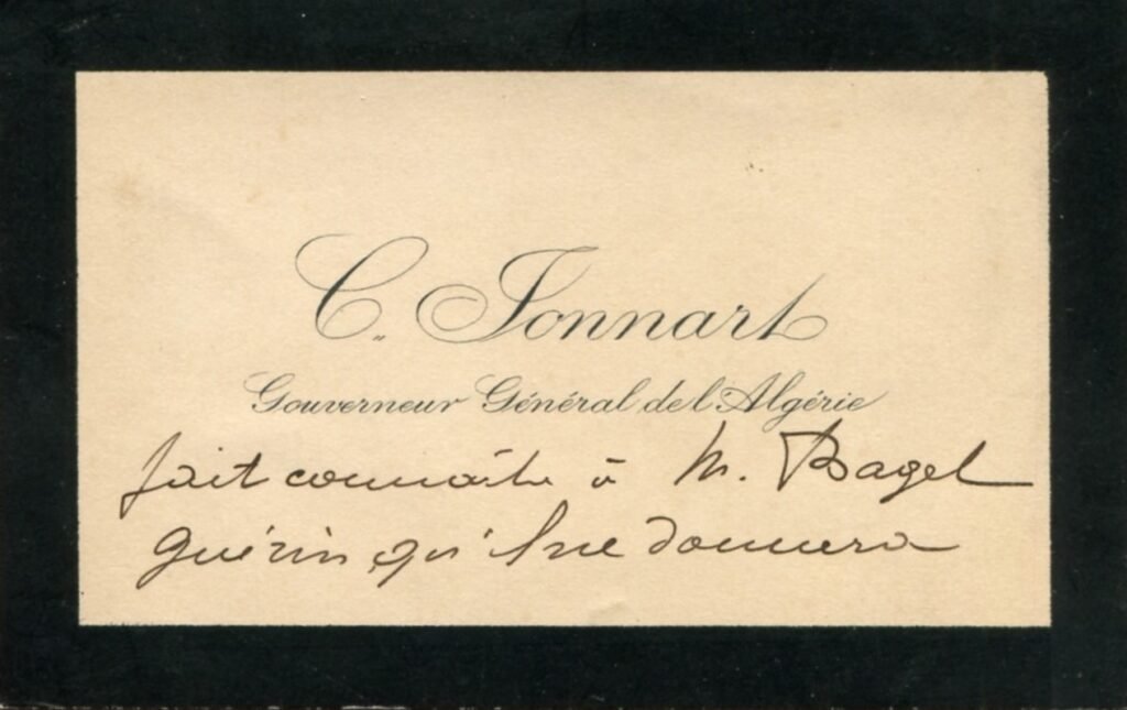 (3) Charles Célestin Auguste Jonnart, né le 27 décembre 1857 à Fléchin et mort le 30 septembre 1927 à Paris, est un homme politique français. Issu d’une famille bourgeoise du Nord, Charles Jonnart fait ses études à Saint-Omer, puis à la faculté de droit de Paris. Séduit par l’Algérie qu’il avait visité jeune homme, il est nommé par Gambetta au cabinet du gouverneur général de l’Algérie en 1881. En 1884, il est nommé directeur du service de l’Algérie au ministère de l’Intérieur. En 1900, il retourne en Algérie, où il est nommé gouverneur général par Waldeck-Rousseau, fonction dont il démissionne en 1901 pour raisons de santé. De retour à Alger en 1903, il contribue à accélérer la carrière du futur maréchal Lyautey. Celui-ci, qui n’était encore que colonel, est promu général et se voit confier par Jonnart l’exécution de la politique algéro-marocaine. En tant que gouverneur d’Algérie, Jonnart met en place le « Comité du vieil Alger » soucieux de préserver le patrimoine historique pré colonisation de la ville.