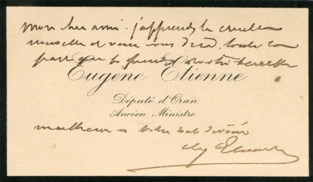 (1) Eugène Étienne, né le 15 décembre 1844 à Oran et mort le 13 mai 1921 à Paris, est un homme politique français. Il fut avant la Première Guerre mondiale l’un des principaux chefs du « parti colonial », avec Auguste d’Arenberg, et organisa notamment en 1892 le Groupe colonial et des affaires extérieures à la Chambre des députés qui comptait environ deux cents parlementaires. Affilié à l’Alliance démocratique, il était gambettiste. Devant l’histoire, il est tenu pour avoir une part de responsabilité dans l’hécatombe de soldats français des premiers mois de la Première Guerre mondiale, ayant refusé de changer les couleurs de leur uniforme, en s’exclamant « Le pantalon rouge, c’est la France ! », alors qu’il était ministre de la guerre en 1913.