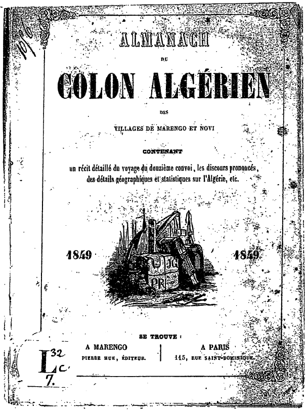 Pierre Hué, colon du 12e convoi, s’installe à Marengo début 1849 et publie un almanach du Colon pour les villages de Marengo et Novi. A la fin de l’ouvrage, il indique envisager de poursuivre pour l’année 1850 si l’almanach rencontre le succès auprès du public. Dans cet ouvrage il témoigne de l’arrivée à Cherchell en cette fin d’année 1848 :