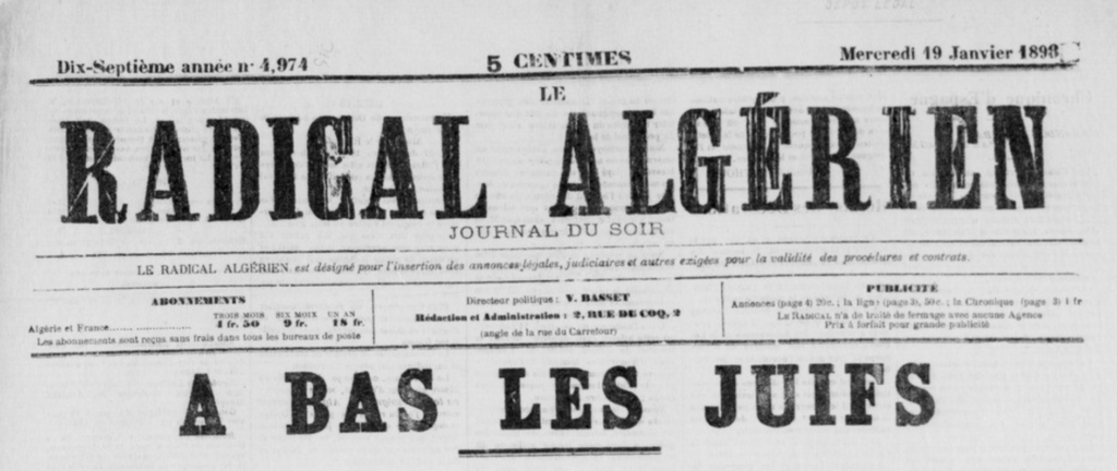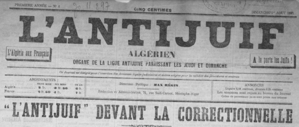 À Alger, Maximiliano Milano, dit Max Régis (un immigré italien), devient une figure emblématique. Élu maire en 1898 et président de la Ligue Antijuive, il mène des campagnes incendiaires via le journal L’Antijuif algérien (1897-1904), déclarant : “Nous arroserons de leur sang l’arbre de notre liberté.” En janvier 1898, des émeutes éclatent : des bandes attaquent des quartiers juifs, brisent des vitrines et agressent des passants, forçant de nombreux Juifs à se barricader. Édouard Drumont, auteur de La France juive et antisémite notoire, est élu député d’Alger la même année.