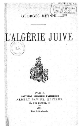 Georges Meynié adapte aussitôt les thèses de Drumont au contexte local avec deux ouvrages : L’Algérie juive (1), publié en 1887 et Les juifs en Algérie (1888). Le discours se radicalise : les Juifs sont dépeints comme des êtres inassimilables, restés « arabes de religion mosaïque » malgré près de vingt ans de citoyenneté. Comme l’écrivait le préfet Charles du Bouzet en 1871 : « Les israélites algériens ne sont pas des Français. Leur langue maternelle est l’arabe qu’ils parlent mal et écrivent en caractères hébraïques […], leurs mœurs sont orientales et chez presque tous, le costume est celui de l’Orient ».
