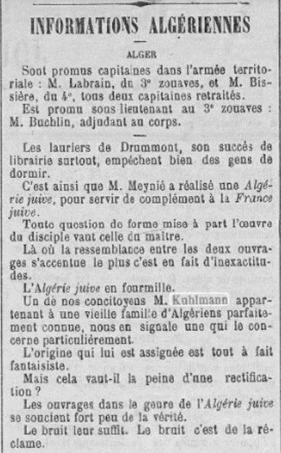 (1) Pour illustrer le contexte politique nauséabond caractéristique de la fin du XIXe siècle, je rajouterai deux documents extraits de la bibliothèque nationale de France. Le premier document trouvé est un article d’un des principaux journaux de la colonie, « l’Akhbar », daté du 5 juin 1887 et qui fait référence à un répertoire des juifs d’Algérie. Suite à la publication en France de l’ouvrage « La France Juive », pamphlet à l’encontre des juifs « contrôlant » l’économie du pays et qui liste les principales familles visées, en Algérie on n’est pas en reste et peu de temps après parait « l’Algérie Juive » publié par un dénommé Meynié. L’article de « l’Akhbar » dénonce fermement ce type de publication tout en précisant les nombreuses inexactitudes qu’il contient et mettant en avant la plus criante à son sens, les Kuhlman… Suite à la publication de « l’Algérie Juive », Sigurd avait cru bon écrire au journal pour mentionner cette inexactitude. Le journal se sert de cet exemple en parlant « d’une vielle famille Algérienne parfaitement connue ».