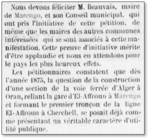 Le 30 septembre 1884, la Mairie de Marengo lance une pétition construire un ligne El Affroun-Marengo – Cherchell. Le Maire, Michel Eugène Beauvais, a pris l’initiative d’envoyer une pétition au Conseil Général Les pétitionnaires font remarquer que le conseil général n’a pas pris en considération suffisamment le bénéfice d’une telle ligne et font remarquer que la gare d’El-Affroun est principalement utilisée par les colons de la région de Marengo, surtout en période des récoltes pendant une période de trois mois. Ils insistent en indiquant que les superficies de Marengo et ses villages satellites (50 000 hectares) sont bien plus importantes que celui d’El-Affroun seul (1100 hectares). La gare de El Affroun est de plus en plus encombrée et les marchandises y séjournent huit à dix jours. On cite par exemple qu’en 1883 une expédition de 1500 sacs de blé resta quinze jours en gare avant de pouvoir prendre son tour de départ.