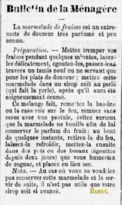 Préparation. — Mettez tremper vos fraises pendant quelques minutes, lavez-les délicatement, égouttez-les, passez-les à travers un tamis neuf ou ne servant que pour les plats de douceur ; mettez cette marmelade dans un sirop cuit au perlé (qui fait la perle), après qu’il aura été soigneusement écumé.