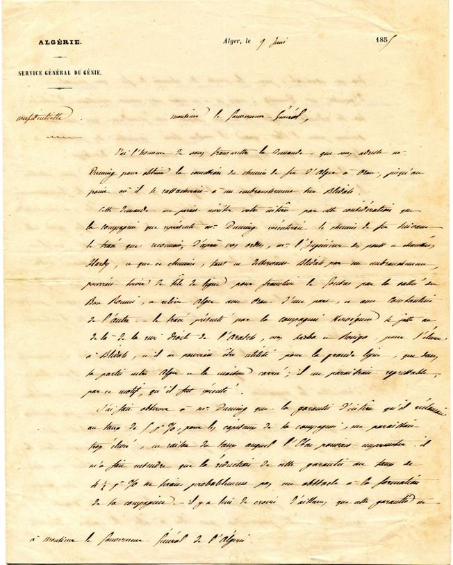 J’ai l’honneur de vous transmettre la lettre Monsieur Duening pour obtenir la construction du chemin de fer d’Alger à Oran jusqu’au point où il le rattacherai à un embranchement sur Blidah. Cette demande me paraît mériter votre intérêt par cette considération que la compagnie que représente Mr Duening exécuterait le chemin de fer suivant le tracé que reconnait, d’après vos ordres, monsieur l’ingénieur des ponts et chaussées Hardy, a que ce chemin fait à desservir Blidah par un embranchement qui pourrait servir de tête de ligne pour franchir le Soutas par la vallée de Bou Roumi en Alger avec Oran d’une part et avec Constantine de l’autre.