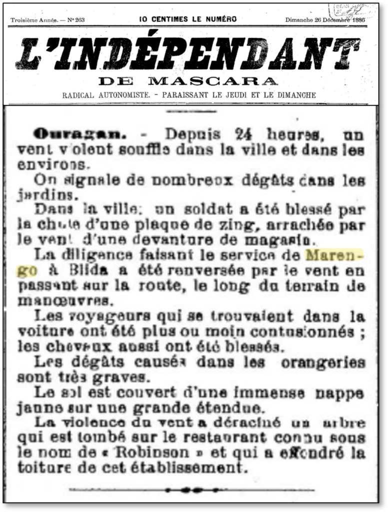 En décembre 1886, un violent ouragan toucha la région de Marengo. Le journal « l’Indépendant de Mascara », en date du 26 décembre 1886, témoigne.