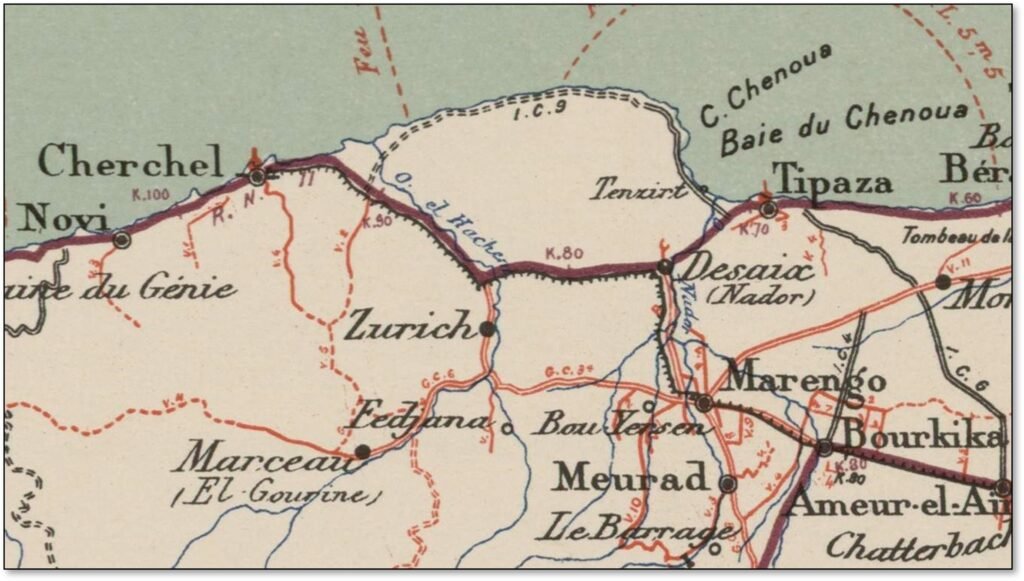 Dans l’arrêté du 3 mai 1871, du Gouverneur général de Gueydon prescrivit des études et travaux préalables à l’installation d’un centre au lieu-dit Nador, sur la route Marengo-Tipasa. Le 16 mars de l’année suivante, une Commission était créée par le Préfet, pour l’étude et l’établissement de ce village. Le 23 juillet, le Maire de Marengo, M. Beauvais, regrette « que Ie nouvel emplacement éloigne le village du chef-lieu de son administration, et par ce motif, réserve son vote ». On se rappelera qu’à cette même date les villages allentours étaient attaqués par la tribu des Menaceurs (voir « Marengo d’Afrique » tome II) et cette insurrection de fut métrisée que début août…