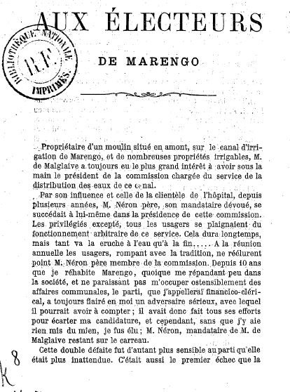 En janvier 1881, la vie politique de Marengo commence à s’animer. sur un ton particulièrement vif dans une Lettre aux électeurs de Marengo signée H. Lemoine (1), mécanicien. D’emblée, l’auteur revendique une posture de combat : il dit s’adresser à des électeurs confrontés, selon lui, à l’influence d’un « parti financico clérical », qu’il accuse de peser sur les affaires locales et de chercher à conserver des positions de pouvoir. Cette « lettre » consititue en fait un véritable pamphlet visant à la fois Jérémie Néron, Maurice de Malglaive et Michel Eugène Beauvais.