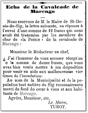 Peu de temps après, le maire de Saint-Denis-du-Sig, le Docteur Turot (2) publiera un encart dans le journal afin de remercier les généreux donateurs de Marengo.