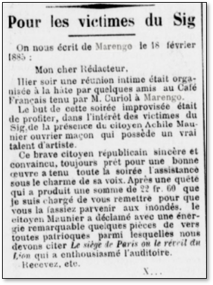 Mais d’autres initiatives privées avaient aussi eu lieu. Au Café Français, une réunion fut organisée pour collecter quelques francs. La soirée fut animée par un certain Achille Maunier, ouvrier maçon qui possédait un vrai talent de chanteur ! Le « Petit Colon Algérien note quelques chansons entonnées par Maunier dont « Le Siège de Paris » et « Le Réveil du Lion » qui ont enthousiasmés l’auditoire …
