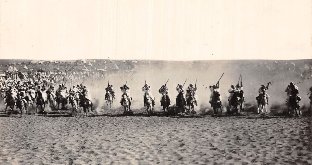 (2) La fantasia est une tradition équestre pratiquée essentiellement au Maghreb — incluant le Maroc, l’Algérie, la Tunisie et la Libye, se manifestant par la simulation d’assauts militaires. Cet art est notamment appelé « jeu de la poudre » ou « jeu des chevaux », et porte divers noms en fonction des régions, dont tbourida au Maroc.