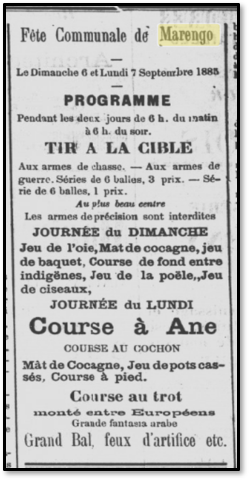 Le journal « la Démocratie » (Echo des centres de la Metidja) publie le 6 septembre 1885 un article intéressant relatant la fête de Marengo qui venait d’avoir lieu.