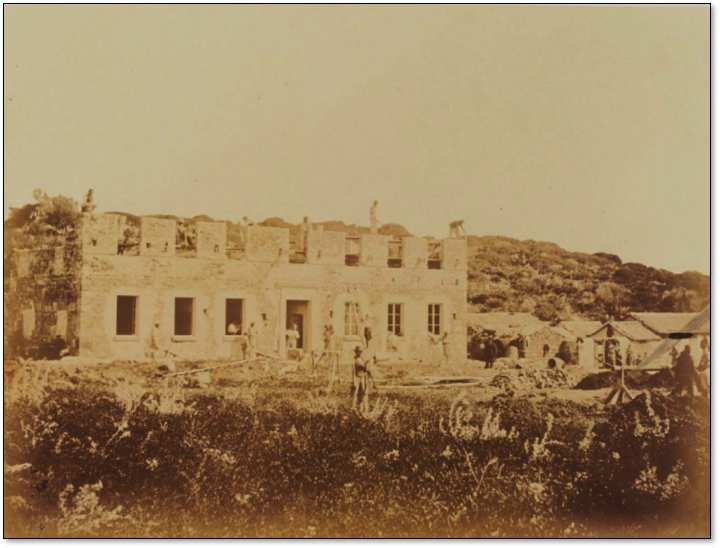la première construction de Tipaza, bâtiment qui deviendra plus tard le poste de douane. Photographie de Première maison de la ville projetée à Tipaza, bâtiment qui deviendra plus tard le poste des douanes. Photographie prise en 1856 de Felix Jacques Antoine (1802-1879).