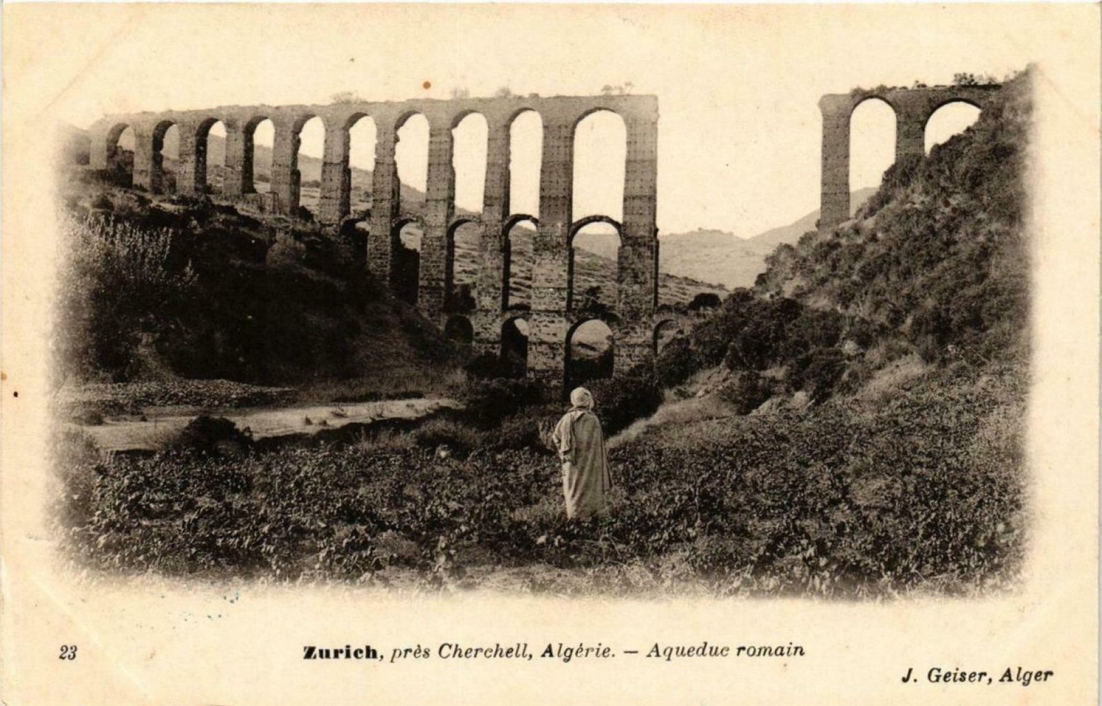 Extrait du Guide Bleu Algérie 1932 : « De l’Oued Bellah, vous remarquerez sur votre droite, en allant à Zurich, se dressant dans une gorge pittoresque, les restes assez bien conservés du « Grand Aqueduc de Zurich ». Il est de trois étages, comprend dix-sept arches et mesure vingt-deux mètres de hauteur. Derrière lui, apparaît un pic, celui du « Lion de Marceau ». A l’entré de l’Aqueduc se trouve une cuve cimentée qui servait vraisemblablement au décantage des eaux, dont l’adduction de Marceau à Cherchell était ainsi assurée au temps des Romains. Mais poursuivez votre route : à 14 kilomètres de Cherchell, après avoir dépassé la Cave Coopérative de Zurich, vous trouverez le village de Zurich, sur les bord de l’Oued El-Hachem. Il comprends 973 habitants auxquels il convient d’ajouter la population des fermes voisines de Fetjana (159 habitants). Vous visiterez avec intérêt la fabrique de crin végétal de M. Bellon, installée sur la limite nord du village. Village modeste et paisible, mais qui fait honneur au colon français, car il représente l’effort considérable accompli dans ce pays, particulièrement insalubre au moment de la conquête, pour le transformer en un centre fertile, où se récoltent aujourd’hui les meilleurs vins d’Algérie ».