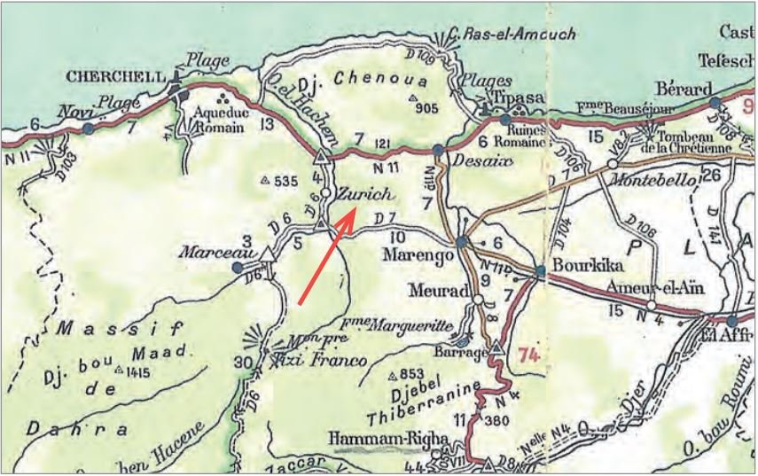 Zurich est un village de la colonisation crée en 1848 qui doit son nom à la Victoire de Massena le 25 septembre 1799. Le convoi qui amena les premiers habitants fût le Convoi n° 13, parti de Paris le 23 novembre 1848 et arrivé à Marseille le 6 décembre. La traversée de la Méditerranée se fera sur la corvette à vapeur Albatros le 9 décembre qui arrivera à Cherchell le 11 du même mois. Contrairement à Marengo, le village peina à se développer. Le changement intempestifs de directeurs de colonies n’aida pas à l’expansion. Il n’eut pas la chance d’avoir comme fondateur et premier directeur un personnage de la trempe du Capitaine de Malglaive. Un certain nombre des premiers colons, survivants de l’épidémie de l’été 1849, s’installeront de plus à Marengo, comme la famille Chapotin.